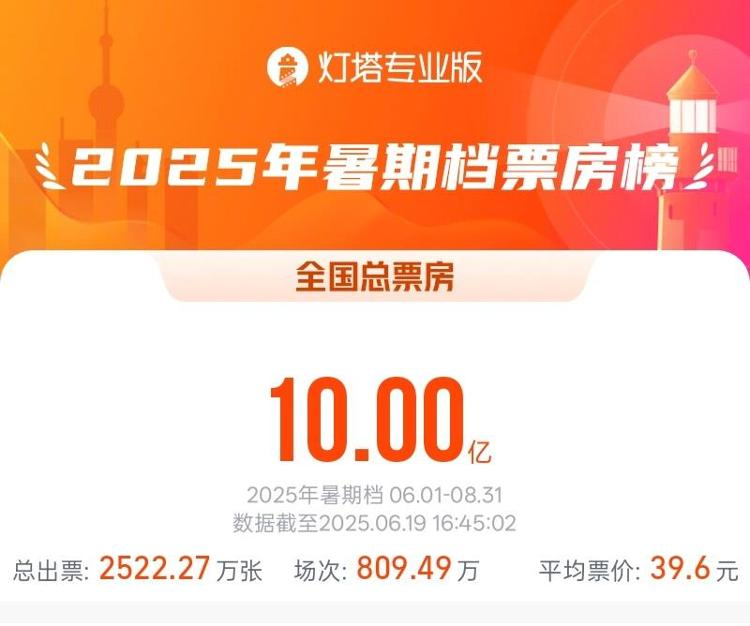 据网络平台数据,截至6月19日16时45分,2025年暑期档(6月-8月)总票房(含预售)突破10亿,《碟中谍8》《时间之子》《新·驯龙高手》《哆啦A梦:大雄的绘画奇遇记》《星际宝贝史迪奇》暂列票房前五名。