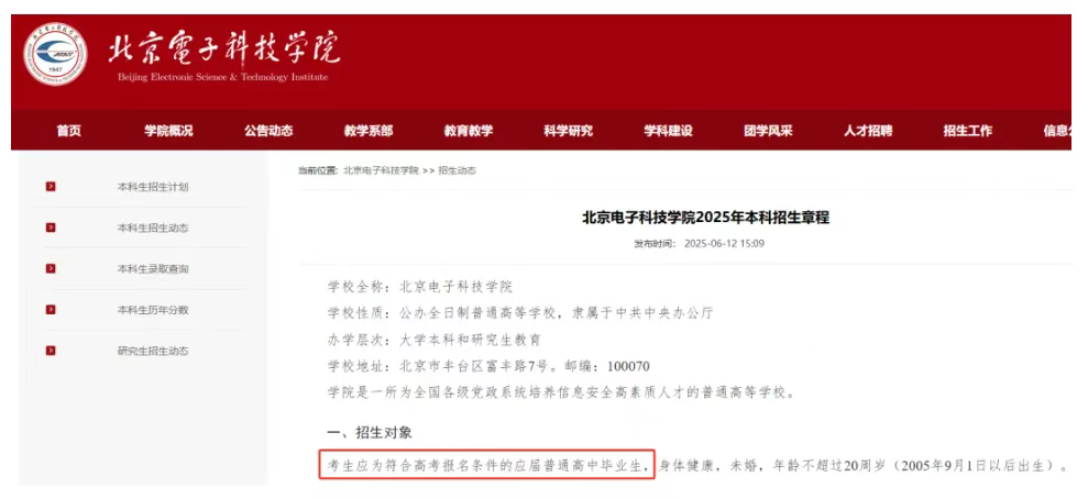 北京电子科技学院2025年本科招生章程指出,招生对象明确指出:考生应为符合高考报名条件的应届普通高中毕业生,身体健康,未婚,年龄不超过20周岁(2005年9月1日以后出生)。