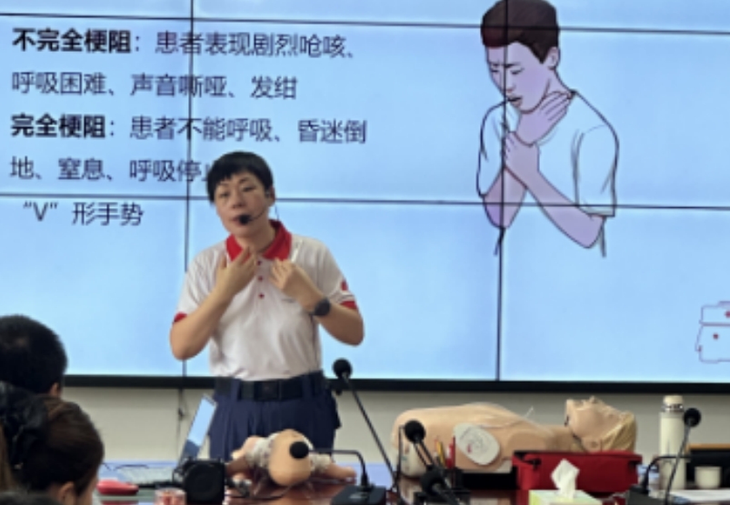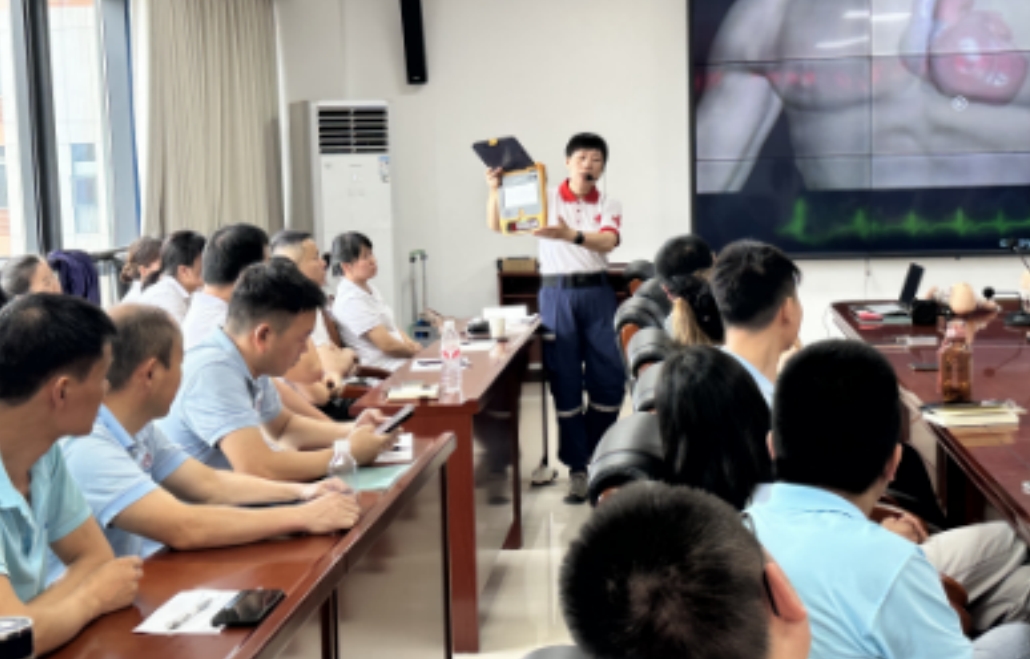 殷慧萍则围绕自动体外除颤仪(AED)展开教学,详细介绍了AED的使用方法及注意事项,确保职工们能够在紧急情况下正确使用这一救命设备。同时,她还讲解了气道异物梗阻的现场处理方法,以及成人与儿童在操作上的不同之处。