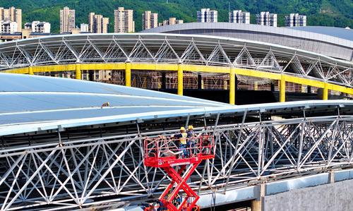 6月27日,石城县西城体育中心项目建设现场,工人在安装体育馆钢结构屋面网架和顶棚。石城县西城体育中心项目包括体育馆、游泳馆、综合馆、体育场等多功能场馆,预计可容纳1万余人。特约通讯员 朱海鹏摄
