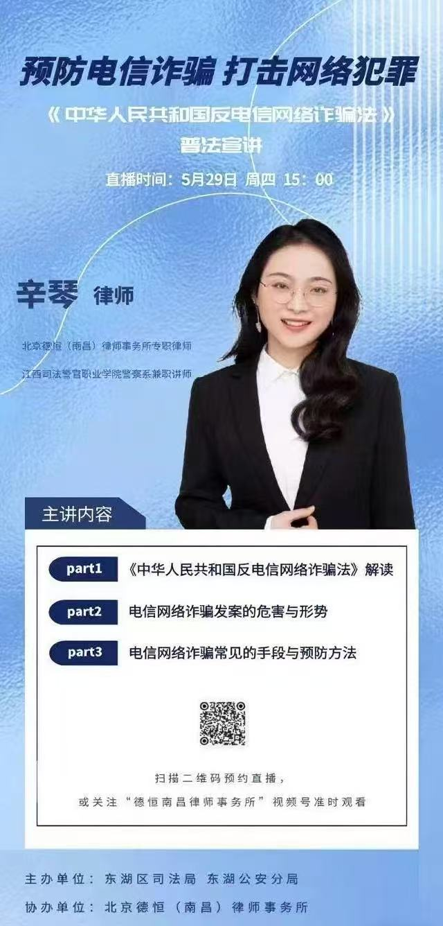 东湖区“法律明白人”联合专业律师开展反诈宣传抖音直播海报