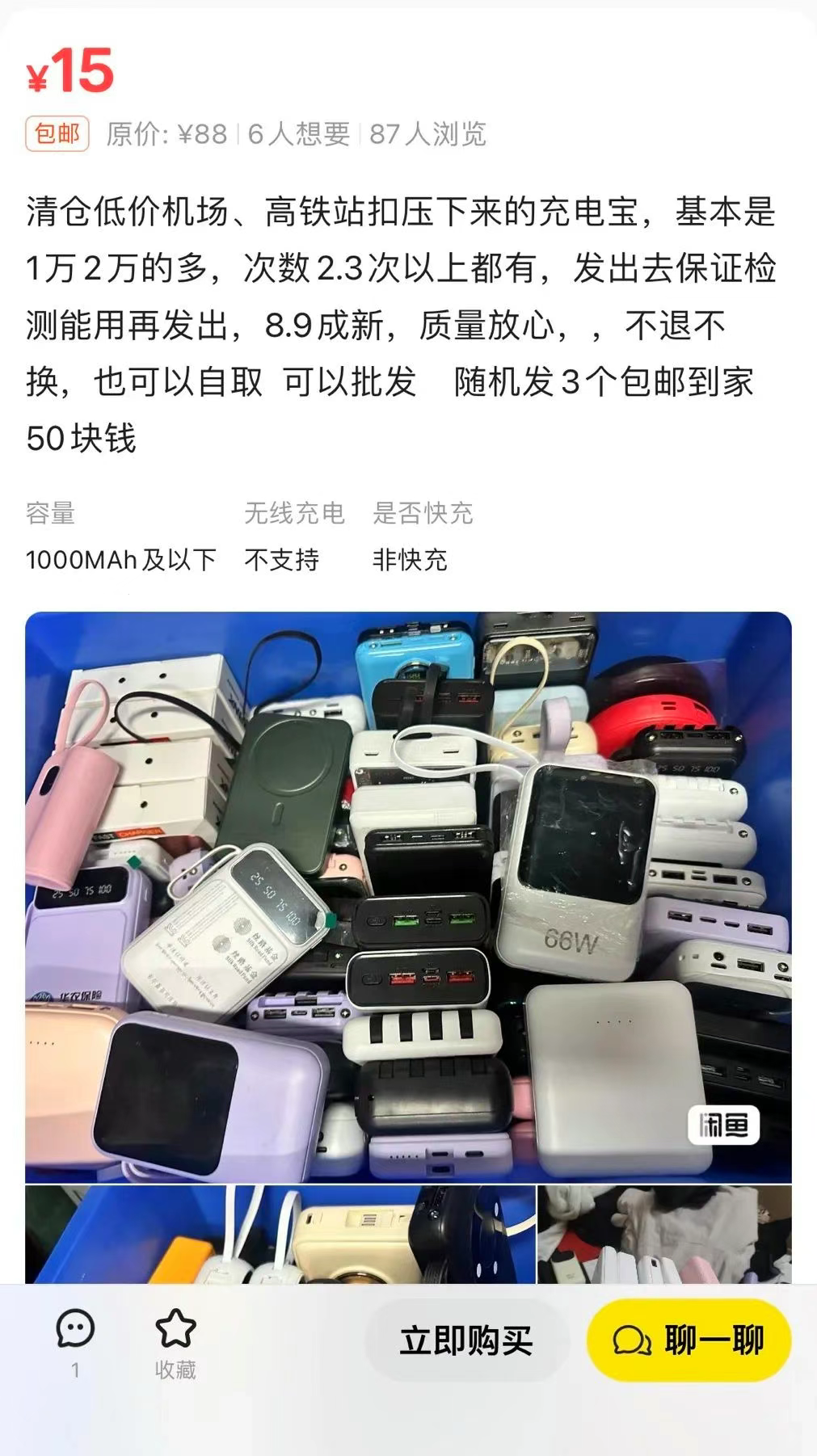 二手平台闲鱼上新大量声称在机场等地被扣下来的二手充电宝,价格低廉。