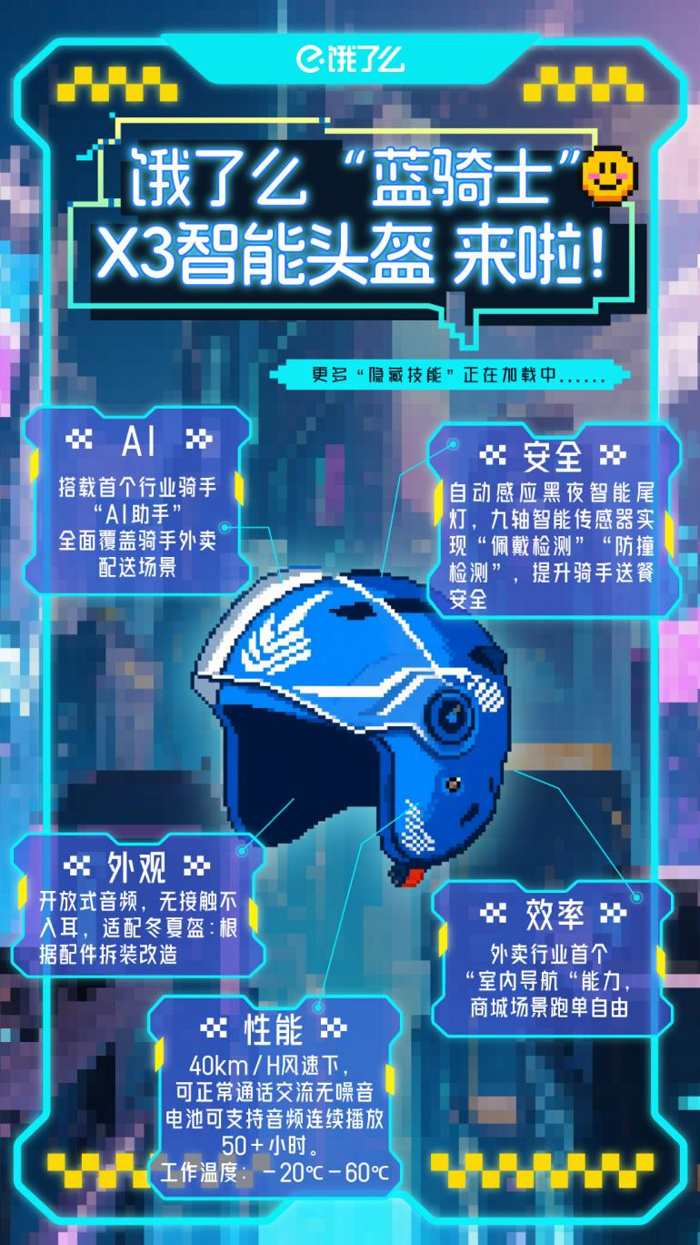 同时,饿了么推出“智能装备关怀”计划,智能头盔系列福利活动覆盖所有蓝骑士,让智能装备助力更多骑手。
