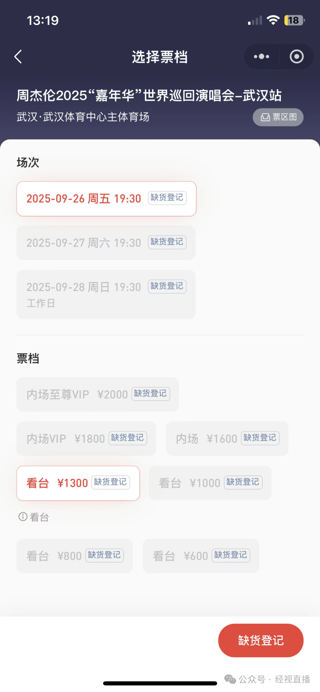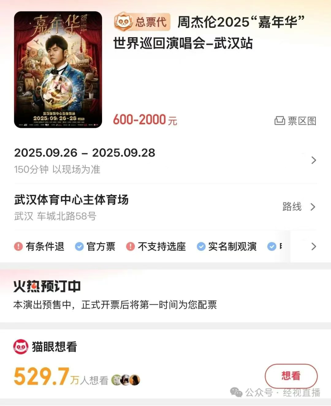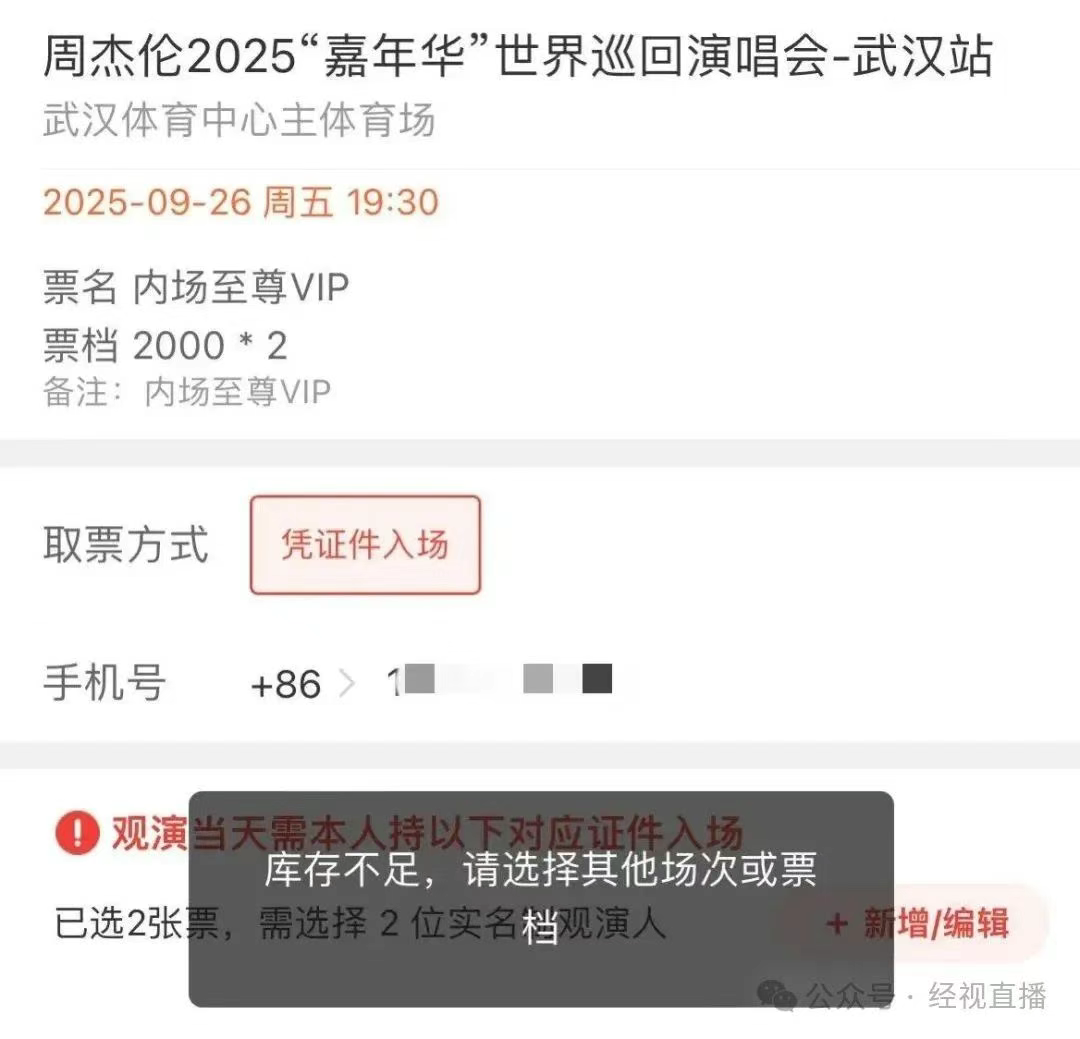 随后,经视直播记者拨打猫眼客服中心电话,工作人员表示,周杰伦2025“嘉年华”世界巡回演唱会-武汉站开票后不到2秒就缺货登记了。“一般每五分钟会刷新一次,可能过一会可能还会再有点回流票。”