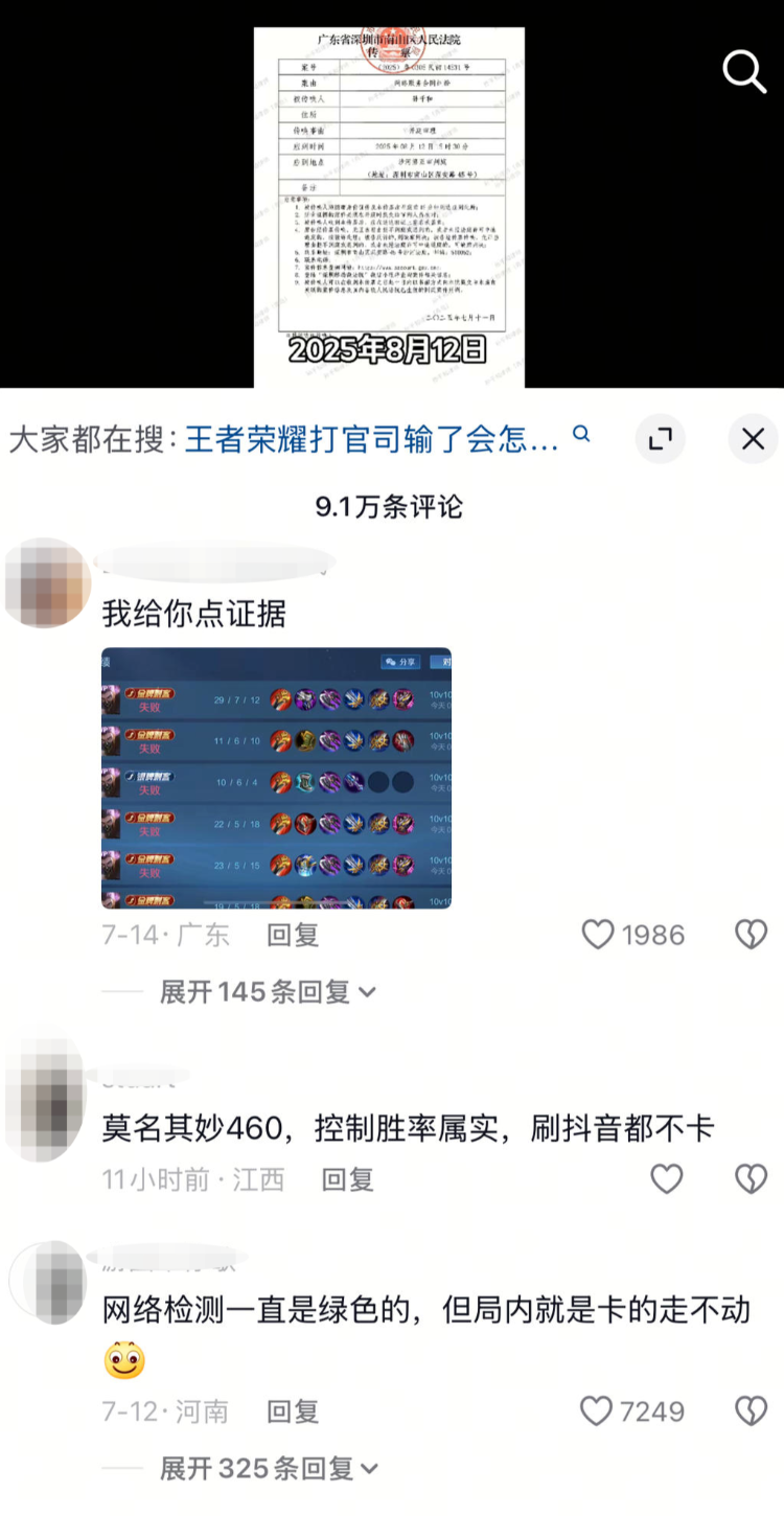 孙千和的视频平台账号关于起诉王者荣耀的内容收到了大量网友评论,很多人在评论区发布自己连败、胜率维持在50%上下、游戏中遭遇信号丢失等截图,表示给孙千和的诉讼提供证据。对此孙千和认为,这些证据在法庭上的证明力都比较有限,玩家确实很难证实自己是被算法针对,自己主要还是从知情权角度提出诉求。