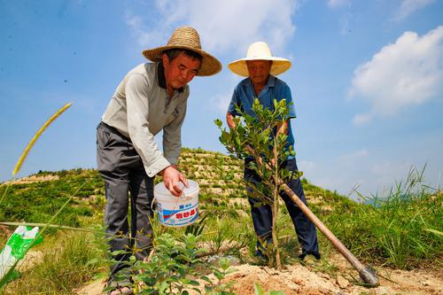 江西省供销本草科技有限公司在赣州市章贡区水西镇上禾村在原先经历山火的山地上,建立了1100亩的现代化油茶示范基地,并科学套种射干、千斤拔、裸花紫珠、虎杖等具有较高经济价值的中药材,惠及110户农户,有效带动当地劳动力就业。江西日报全媒体记者 吴福清摄