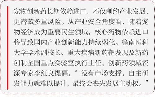 宠物创新药长期依赖进口,不仅制约产业发展,更潜藏多重风险。从产业安全角度看,随着宠物经济成为重要民生领域,核心药物依赖进口将导致国内产业创新能力持续弱化。李红良提醒,“没有市场支撑,自主研发能力就难以提升,最终会丧失发展主动权。”