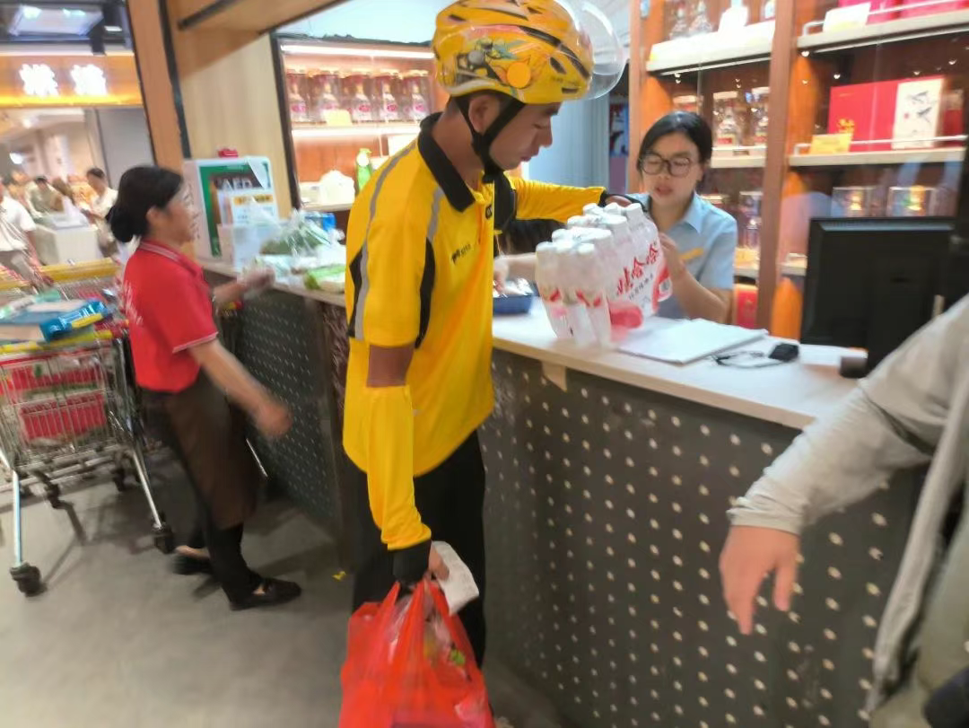 8月12日一大早,地处繁华街区的瑞金国光超市里人头攒动。“还有一份猪肝没配齐。”前台工作人员对陈一文说。刚开工的陈一文接了3单,要在30分钟内送达。这是第三单,顾客在超市下单了一箱矿泉水、一袋菜。