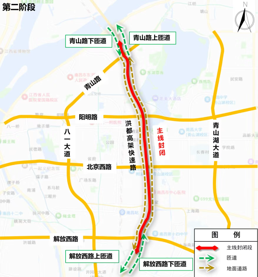 2、由南向北车辆可经解放西路下匝道—洪都大道—青山北路上匝道通行。