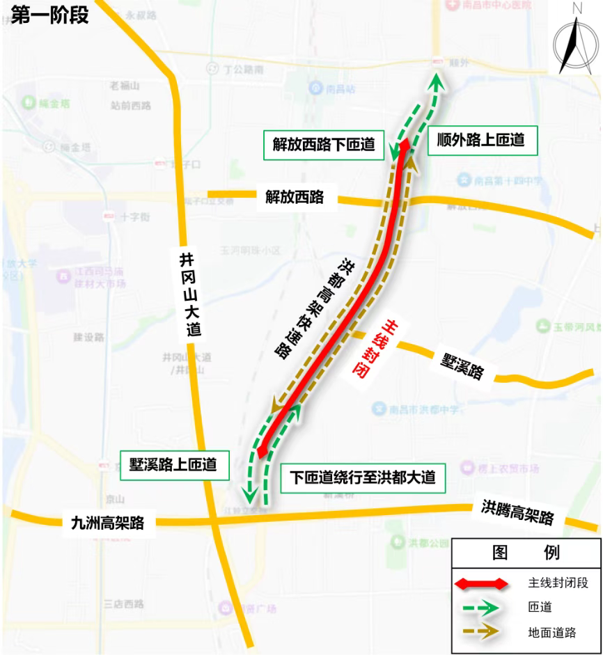 2、由南向北车辆可经墅溪路下匝道—洪都大道—顺外路上匝道通行。
