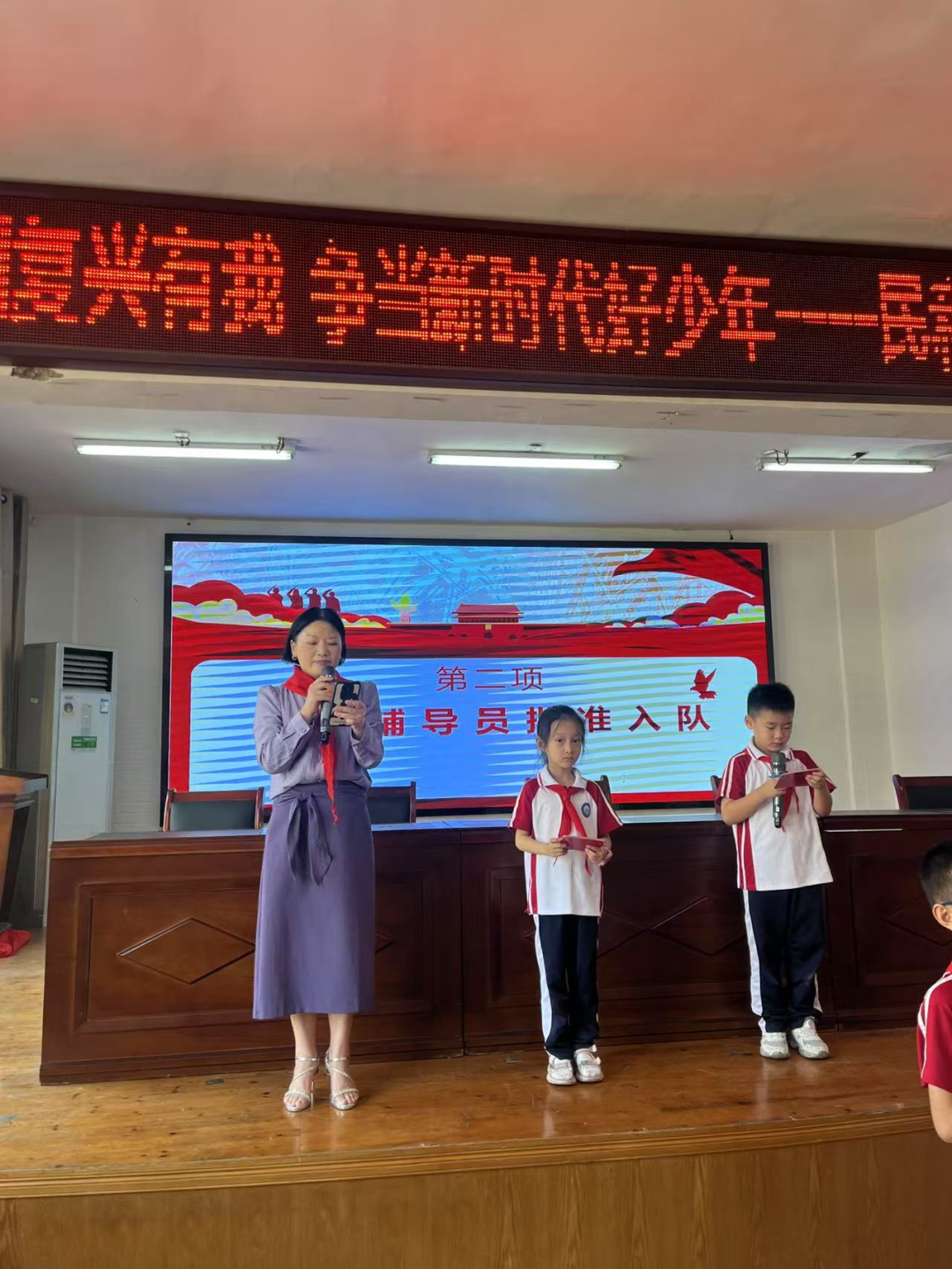 最激动人心的时刻到来——由辅导员和优秀少先队员们为二年级新队员佩戴红领巾。当鲜艳的红领巾在新队员胸前飘起时,他们脸上洋溢着无比自豪和激动的笑容。
