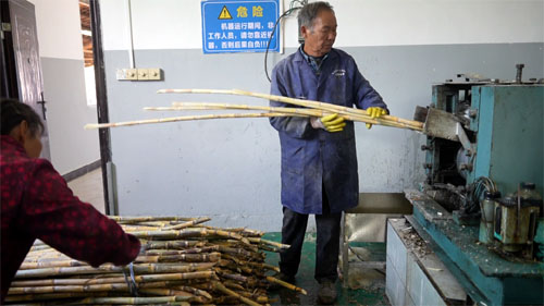工人将甘蔗放入机器取汁