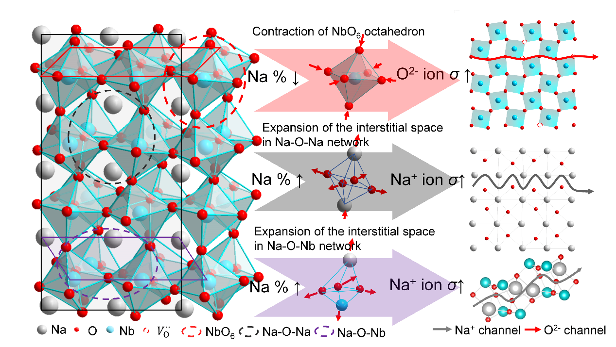 近日,南昌航空大学动力与能源学院(绿色通用航空动力江西省重点实验室)教师刘智勇、孙海俊牵头,联合西安理工大学、西北工业大学研究人员在钙钛矿离子导体领域取得突破。团队创新性地通过精准调控NaNbO3基陶瓷的A位非化学计量比,诱导形成“缺陷类型—氧八面体畸变—离子通道”的动态适配体系,成功构建兼具可调离子和定向离子高传导性的新型陶瓷,其核心机理突破为固态电池离子传导材料研发提供了全新范式。该研究成果发表于《自然·通讯》。