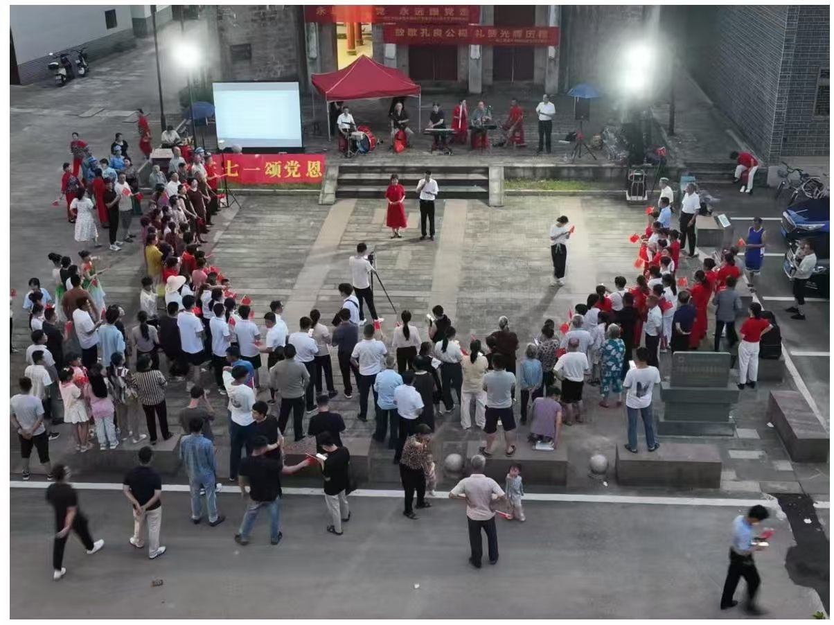 夜幕降临,孔良公祠广场上热闹非凡。服务队与当地群众共同参与了赣江源镇“庆七一 共欢歌”干群联合活动。队员们与现场群众手拉手、围成圈,伴着音乐歌唱、舞蹈,用欢快的旋律和热情的舞姿,展现了宗祠文化与乡村建设的融合之美。这场夏夜的露天活动,不仅拉近了队员与村民的距离,更成为弘扬文明乡风、促进乡村和谐的生动缩影。期间,队员们还走进田间地头与村民家中,在调研中感悟乡土文化与新时代乡村发展的结合点,让优秀传统文化在乡村振兴中焕发新活力。