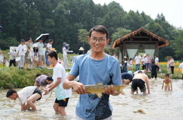 浑水摸鱼区域更是热闹非凡,大人小孩挽起裤脚、赤脚踏入池塘,在浑浊的水中摸索着鱼儿的踪迹,溅起的水花与欢快的笑声一同荡漾。“今天摸了三条鱼,感觉很好玩!我去年就来过一次,今年特意带着家人再来。这里环境好,有很多适合小朋友玩的项目,特别适合过国庆。”从峡江县金江乡赶来的游客胡志富说道,“抓鱼虽然有点困难,但抓到鱼的那一刻特别有收获感,能把上班的压力都抛开。”