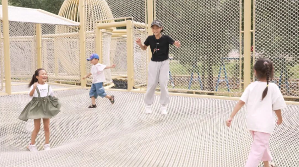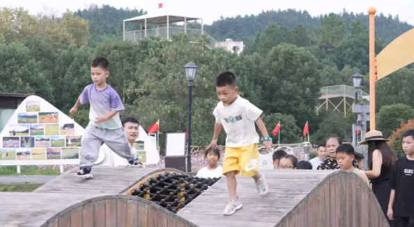 趣玩欢乐谷”内更是笑声不断。升级改造后的儿童乐园里,主题城堡、双龙秋千、沙池蹦云等设施前,孩子们尽情奔跑嬉戏,家长们则在一旁拍照记录美好瞬间。色彩绚丽的彩虹滑道上,尖叫声与欢呼声此起彼伏,游客们乘坐滑圈顺势而下,感受速度与激情;花海小火车缓缓穿梭在田野间,稻苗清香萦绕鼻尖,游客们纷纷举起手机,定格这份田园浪漫。“带着孩子坐小火车看风景,感觉特别惬意。”来自附近乡镇的游客张先生笑着说。