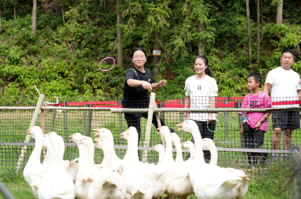 “活力能量场”的互动项目同样人气高涨。上午10时,田园套鹅区刚一开放,便排起了长队。游客们手持套圈,屏息凝神瞄准目标,套中的欢呼声与未套中的惋惜声交织在一起。“我套中两只!诀窍就是看鸭子抬头的时候赶紧扔圈,特别好玩,套到了特别开心!”刚收获“战利品”的游客刘红斌兴奋地分享着自己的经验。
