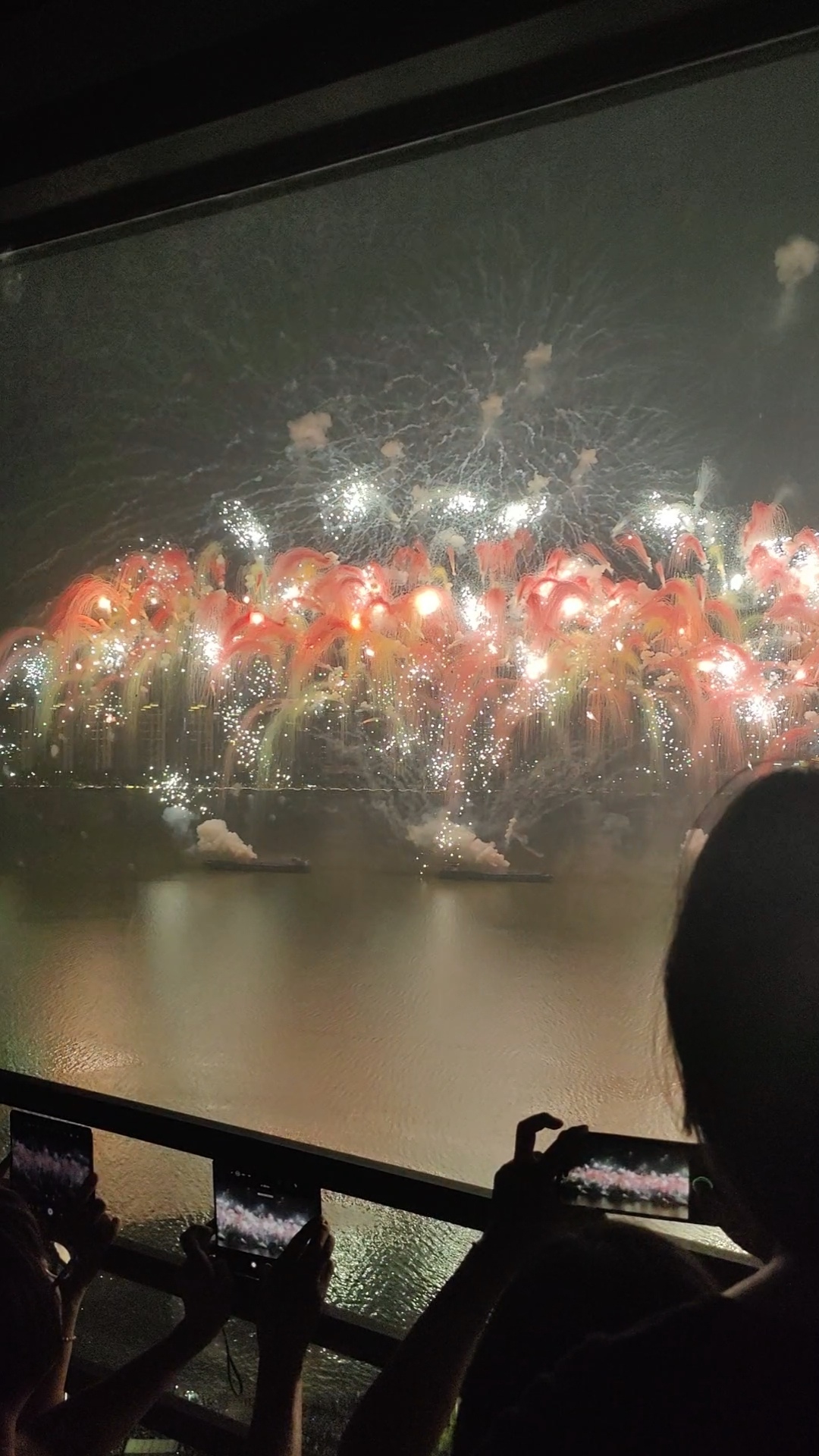 夜幕降临,赣江江面江面先被一簇簇绚丽的烟花点燃。红色、金色、绿色的烟火如瀑布般倾泻,在江面之上绽放出层次丰富的画面,有的如繁花锦簇,有的似流星曳尾,引得岸边观众纷纷举起手机记录这一美好瞬间。烟火表演中,传统烟花的热烈与璀璨被展现得淋漓尽致,每一次绽放都像是在夜空中书写的华丽篇章,将赣江的夜晚渲染得如梦似幻。