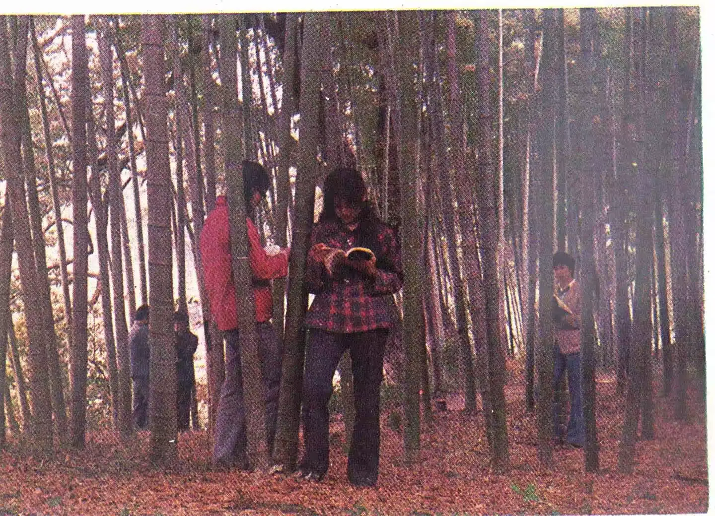 课余时间,同学的休闲去处,也大多离不开毛竹林。独自一人,踯躅林中,手里拿着卷成筒状的林业杂志,不知是在背诵还是在思考?两三个同学,并排走在竹林间的小路上,秋日的夕阳越过河水,斜透进密集的林中,把柔美的金光斑驳的照射在学子身上。学子们沐浴着金光,边走边谈笑。也许他们在谈论人生理想,也许在畅谈中国的林业未来。