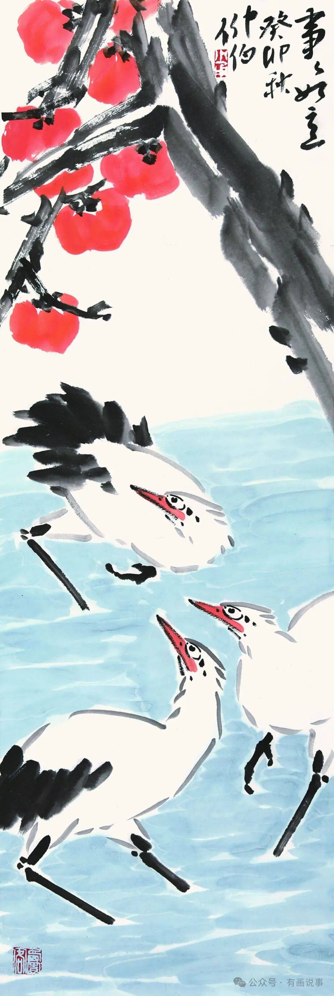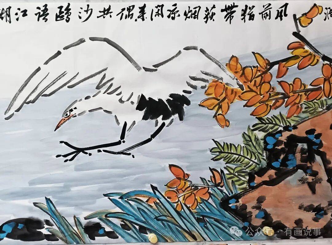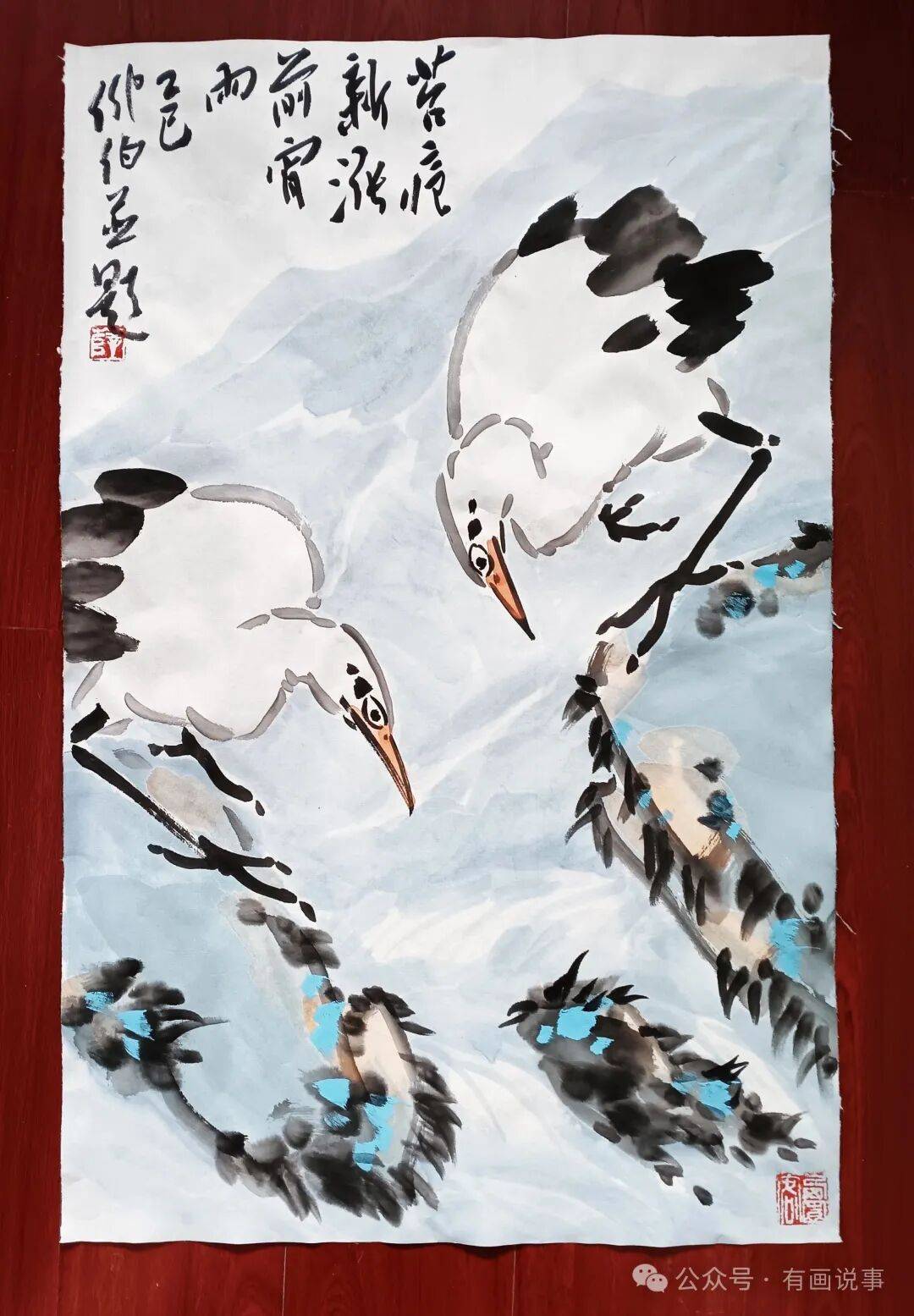 金石为骨:他巧妙地将书法、篆刻中的“金石味”融入造型。勾勒白鹭喙、足及关键羽翼的线条,如“锥画沙”,沉雄老辣,充满力度,赋予其铮铮铁骨。这使得他的白鹭在飘逸中蕴含着不可摧折的刚健,避免了柔媚与浮滑。