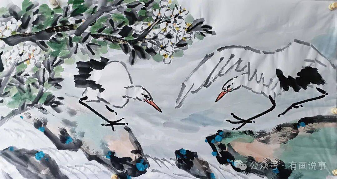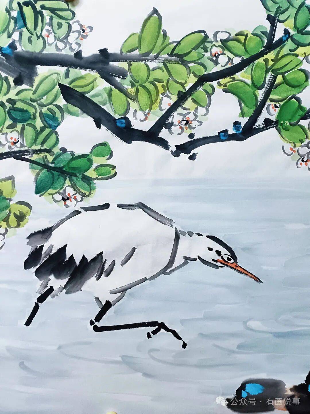 书卷为韵:与此同时,他以水墨的浓淡干湿渲染白鹭的体态与周遭的环境,墨色清润,层次丰富,营造出云水氤氲的意境,这便是其作品中特出的“书卷气”。尤其是大面积的留白处理,计白当黑,使画面空灵辽阔,给予了白鹭无限的精神活动空间,正如其画境:“云外已知天水阔”。