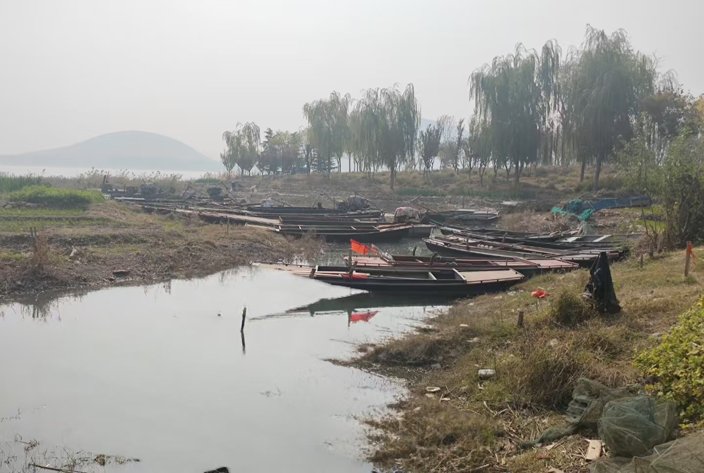 我沿着湖岸继续前行。四周静得出奇,连一个钓鱼的人都看不见。听说赤湖要休养十年,禁了捕,也禁了养。放眼望去,湖边那几只旧船静静地搁浅在滩涂上,缆绳松松地垂在水里。它们闲在那里,不再有往日的忙碌,而是在漫长的休憩中,与这片水域一同沉入了一场深沉的梦。远处的堤岸上,车辆偶尔驶过,却无人停留;除了我这个漫步者,再不见其他行人。这份寂静,让冬日的赤湖更添了几分遗世独立的意味。
