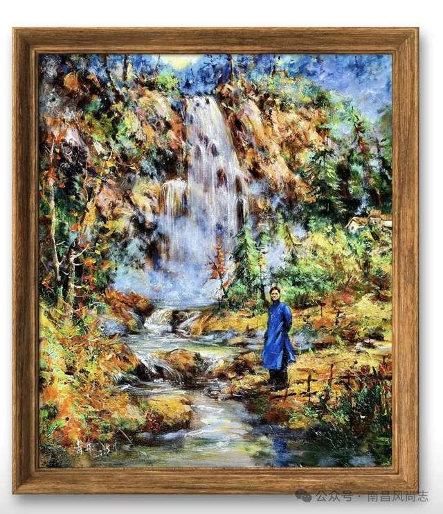 袁兄知我爱家山风景,他不辞辛劳,将“白米下锅”大瀑布绘成油画,并把我也画入画中,观山看景,尽享山林之乐。去年为我画肖像,今年为我画风景,一年赠我一张画,情暖在心中,一言难尽。袁兄厚我,一世情缘。
