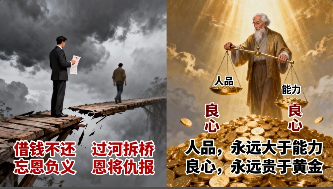 更令人痛心的是,在现实生活中,还有一些人不仅借钱不还,甚至过河拆桥、恩将仇报。他们在困境中得到他人的帮助后,非但不心怀感恩,反而为了谋取私利,在背后耍心机、玩阴谋,对帮助过自己的人落井下石。这种行为,是对人性善良的亵渎,是对社会公序良俗的公然挑战。人可以精明,但绝不能没有底线。在人际交往中,我们应该坦诚相待,不玩弄手段,不欺骗他人。只有行的正、坐得端,才能赢得他人的尊重和信任,在社会上站稳脚跟。