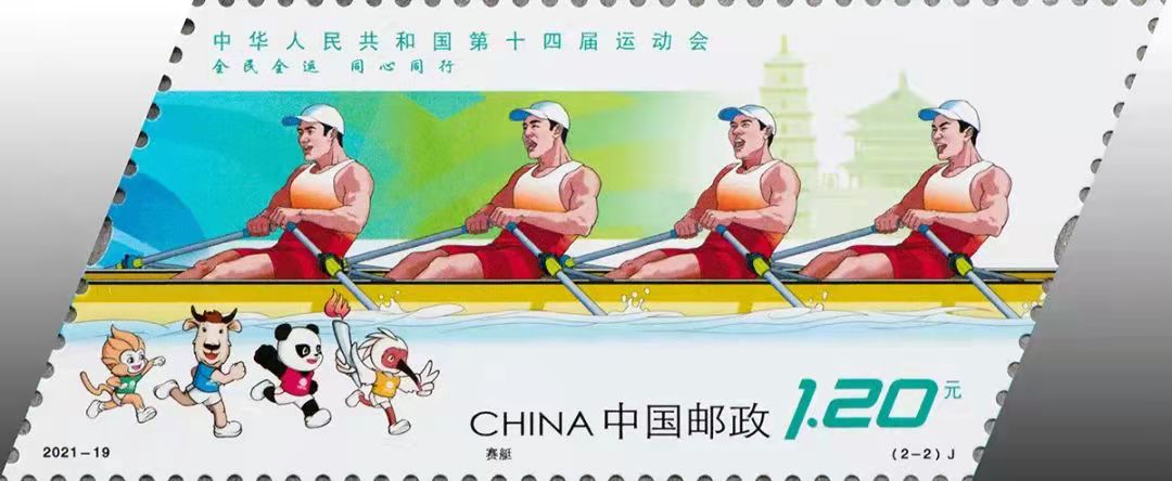 第2枚邮票为“赛艇”,由男子四人双桨无舵手等元素展开设计。这是陕西的又一优势体育项目,在历次的国内外体育赛事中为陕西乃至国家争得了荣誉。