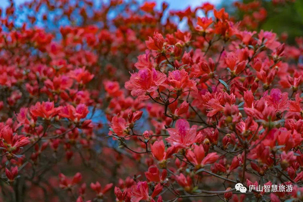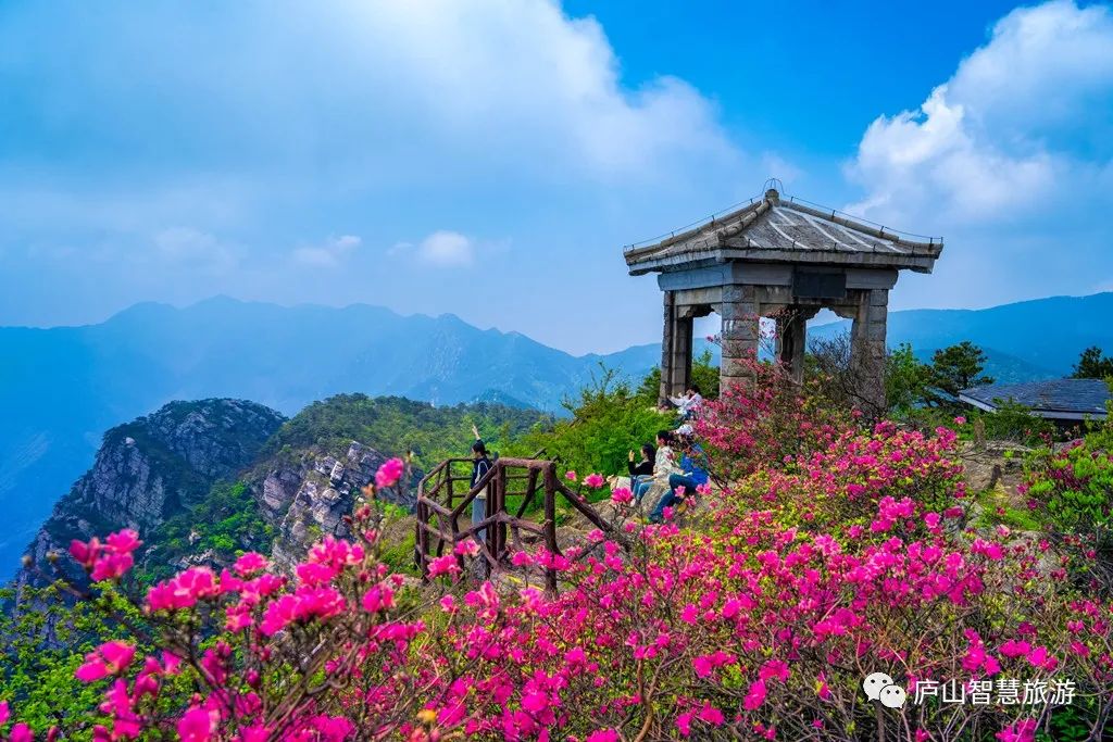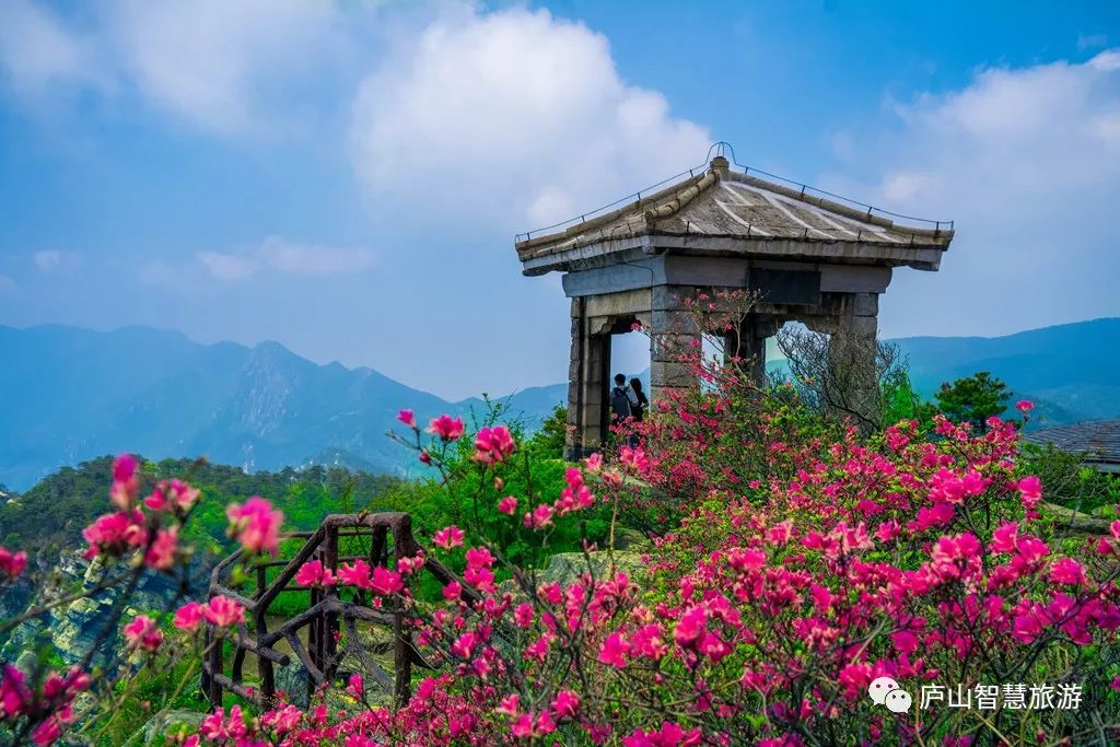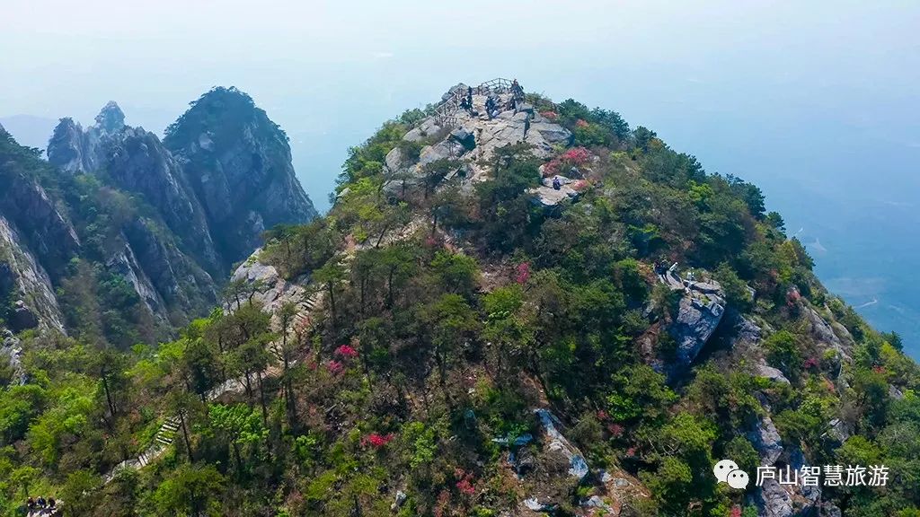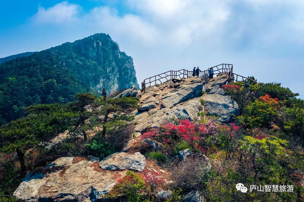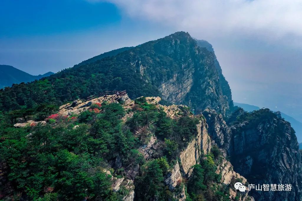 初夏,五老峰顶杜鹃花开红夹路,游庐山的绝佳去处。