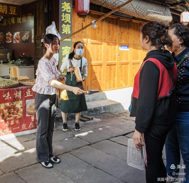 母女俩主动与游客分享她们制作的怪味胡豆,希望更多人喜欢她们家的产品。