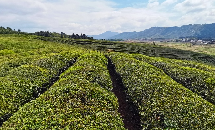 如同绿茸茸的地毯在山间铺开,顺势而走的茶垄起伏绵延