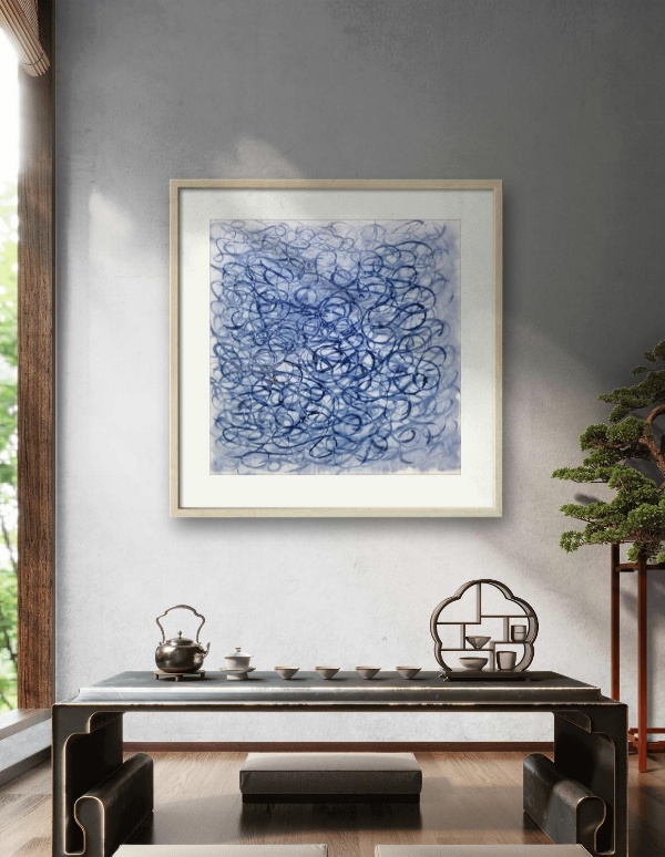 吕元瓷板画的色彩运用与构图形式,能有效营造出宁静的氛围。以蓝色调为主的作品,如《& - 太极》系列,蓝色所具有的冷静、沉稳特质,恰似一汪幽潭,能瞬间抚平人们内心的波澜。深浅交织的蓝色线条,在瓷板上看似无序却又蕴含着内在秩序地交织,如同自然万物的生长规律,传递出一种静谧与和谐之感。在禅意空间与茶室中,这样的氛围与人们追求的平和、安宁相契合,能让身处其中的人忘却外界的喧嚣纷扰,沉浸于内心的宁静之中,仿佛置身于清幽的山林、寂静的古寺,享受片刻的心灵安宁。