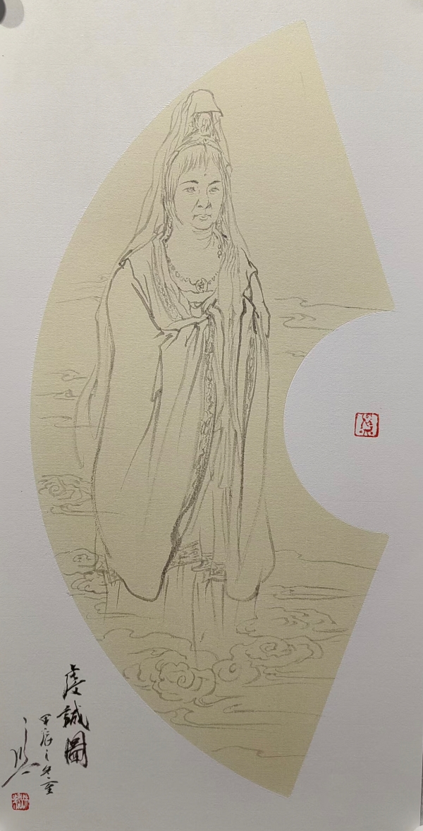 在技法上,秋鸣未随现代西方素描湖流,而是回归传统中国画的线条。这幅白描作品以简洁的形式展现出了线条的生命力,纤细的线条流畅自然,精准勾勒出观音菩萨庄严、慈悲的形象。