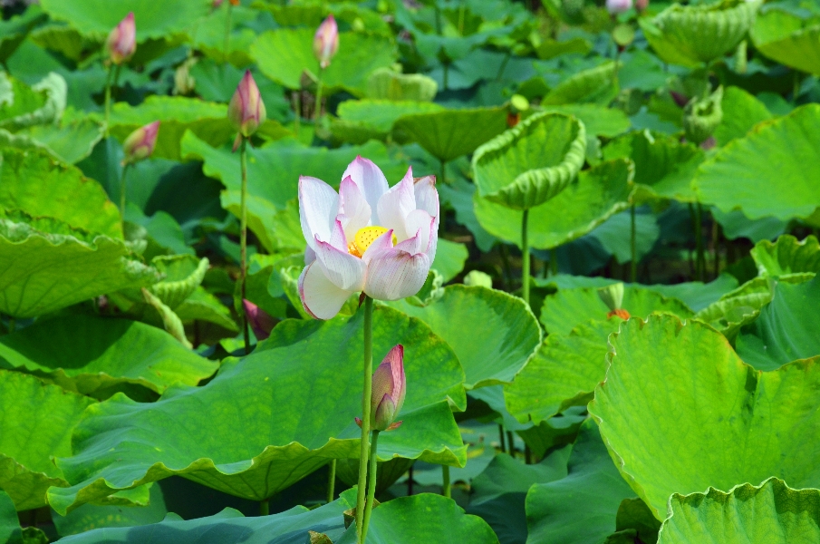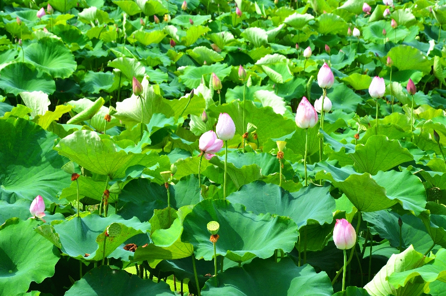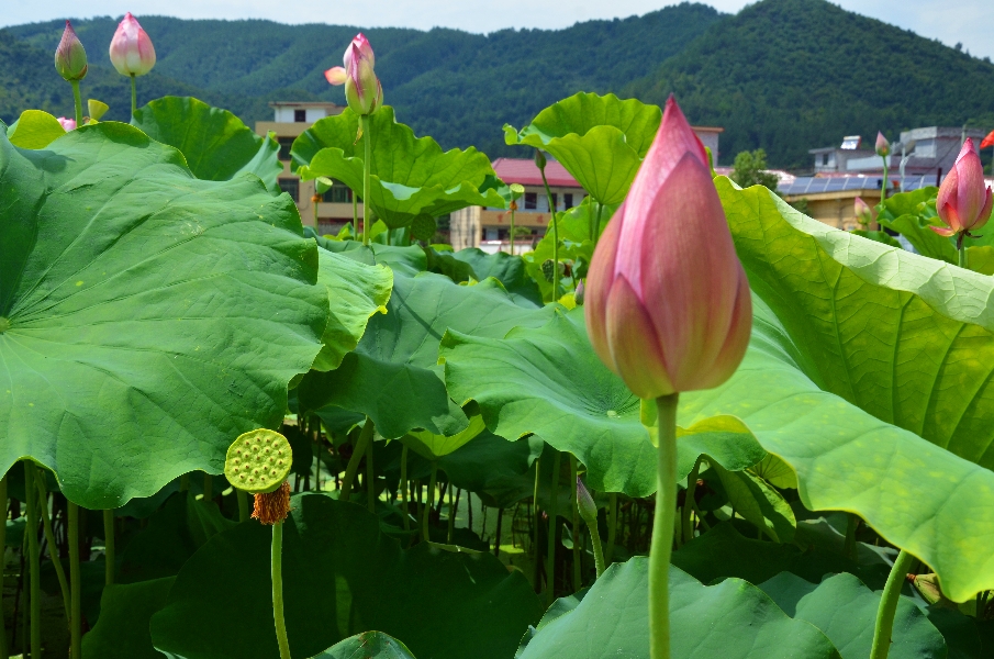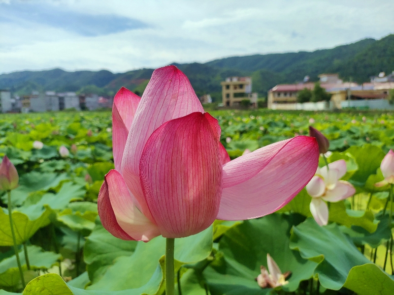 车子驶入村口,迎面是一块刻着“省级美丽乡村示范点”的石碑。几辆满载新鲜莲藕的电动三轮车从我们身边驶过,轮胎上的泥浆还带着荷塘的湿润气息。转过最后一个弯道,一大片绿色猛然闯入视野,那是足以让人震撼的绿。荷叶挨挨挤挤铺满水面,大的像撑开的绿色大伞,为水域撑起阴凉;小的似浮动的铜钱,随着水波轻盈舞动。微风掠过时,整片荷塘瞬间活了过来,绿叶翻卷着,发出细碎清脆的声响,是它们在轻声交谈,分享着生长的喜悦。荷花从叶缝间探出头来,姿态各异。有的完全绽开,花瓣舒展得近乎透明,嫩黄花蕊簇拥着青绿莲蓬;有的半开半合,犹如羞怯的少女半掩面容;还有的仍是紧裹的花苞,蓄着一股劲儿。粉的、白的、紫的荷花,在阳光下闪烁着微光,像缀在绿绸上的琉璃。