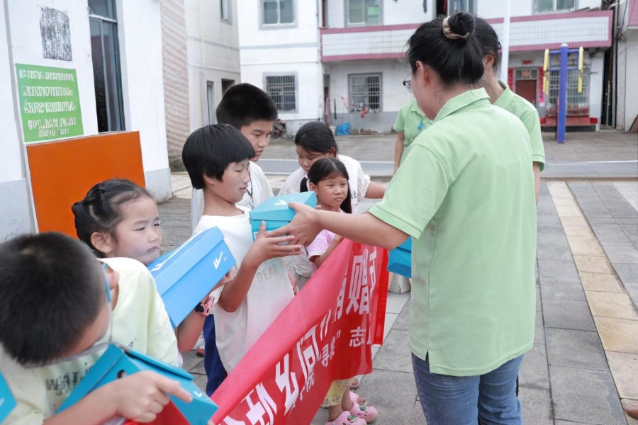 在捐赠现场,志愿者将承载爱心的回力鞋递到孩子们手中,孩子们接过礼物,脸上洋溢着灿烂笑容。简短而温馨的捐赠仪式上,志愿者与孩子们共同举起写有“捐赠载爱,奔赴乡间”的横幅并合影,定格美好瞬间。