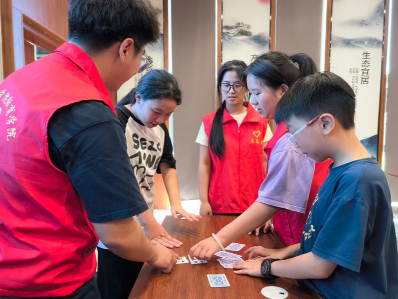 随后开展的趣味数字课堂,以扑克牌为主要教具。借助扑克牌上的简单数字和不同花色,志愿者老师们引导孩子们积极参与课堂小游戏。这些趣味数字小游戏,不仅有效提高了孩子们的反应力和注意力,还大大增强了志愿者老师与孩子们之间的互动。