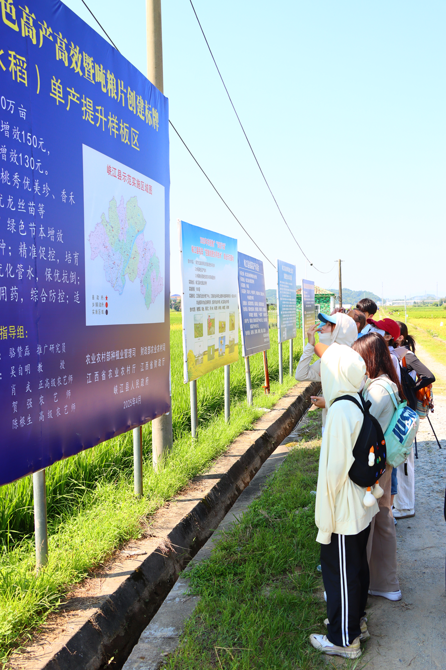 为夯实专业基础,助力水稻种植。2025 年 7 月 4 日,江西农业大学农学院“金坪青禾”振兴服务队在汪欲鹏老师的带领下,前往全国(峡江县水稻)单产提升样板区开展实践学习活动。在样板区,队员们深入了解不同水稻品种的特性差异,观察不同栽培措施下水稻的长势变化。通过汪老师的现场讲解,队员们接触到许多课堂上未曾提及的专业知识,对水稻种植技术有了更直观的认识。此次活动不仅提升了队员们在水稻种植方面的专业知识水平,更为他们未来投身相关的农业工作奠定了坚实的基础。(作者:陈梦婷)