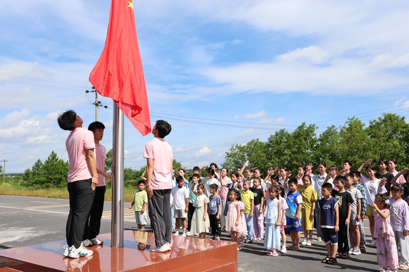 旭日东升,辉映赤帜。一场庄严肃穆的升国旗仪式正在举行,实践队队员和在场观众神情庄严肃穆,身姿挺拔如松,怀着无比崇敬的心情齐聚于此,表达对党的无限忠诚与热爱。
