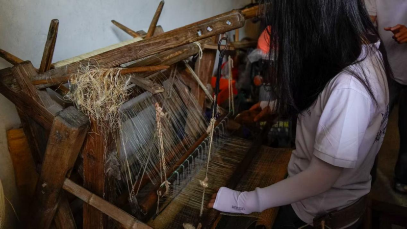 图为实践队员徐荟荟体验夏布非遗传技艺。宁泽豪 摄