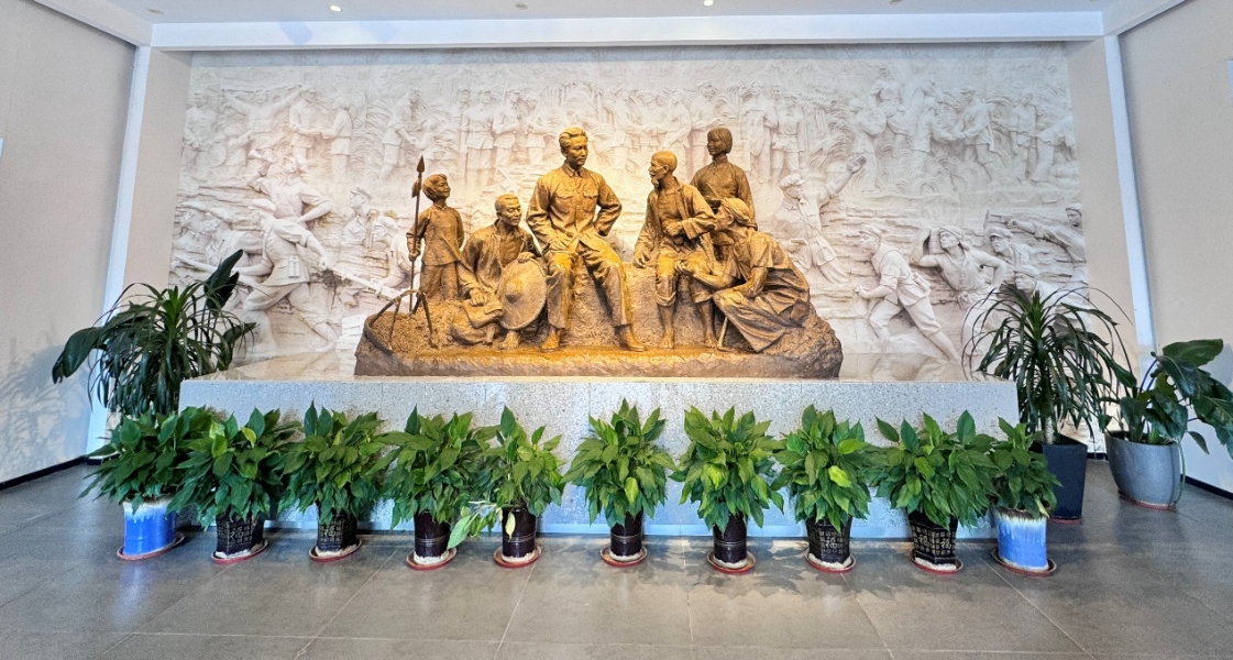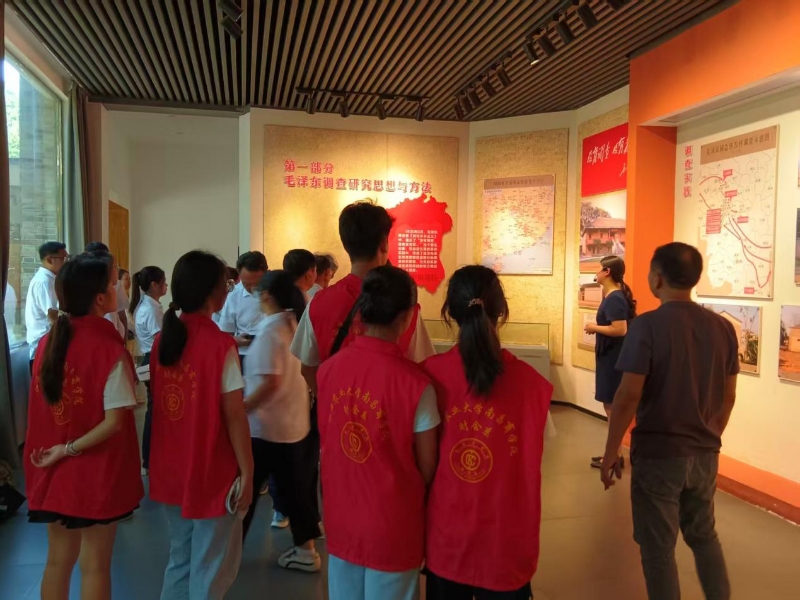 走进纪念馆大门,一尊“毛主席与群众座谈”的雕塑映入眼帘:主席坐在长凳上,身体前倾,认真倾听老乡说话,身旁的农民捧着旱烟袋,脸上带着淳朴的笑容。讲解员轻声介绍:“1933年,毛主席历时十多天,走遍长冈乡的家家户户,写下《长冈乡调查》,提出‘没有调查就没有发言权’的著名论断。”志愿者们围在雕塑前,仔细观察人物的神态细节,数字财贸学院的小肖拿出笔记本:“我们做市场调研时总说要‘精准画像’,原来80多年前,革命先辈就用脚步践行着‘精准调研’的理念。”