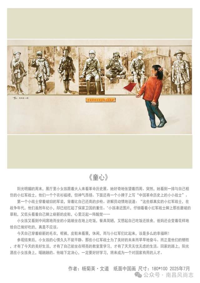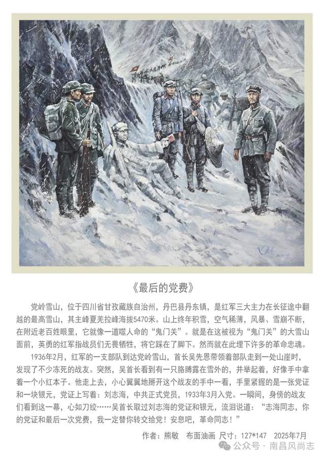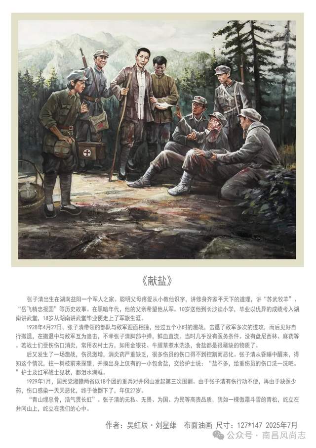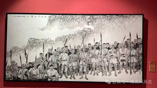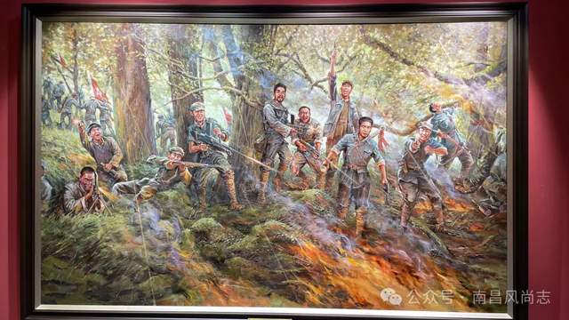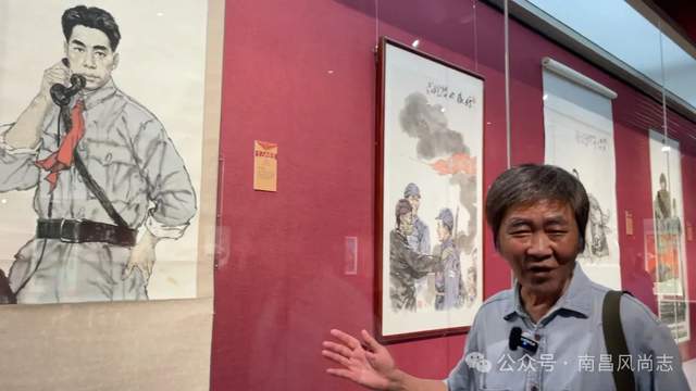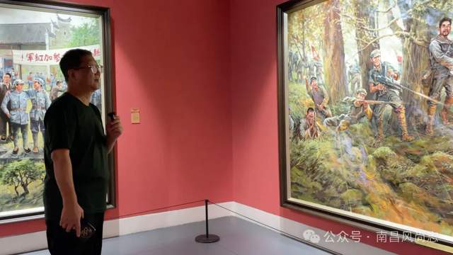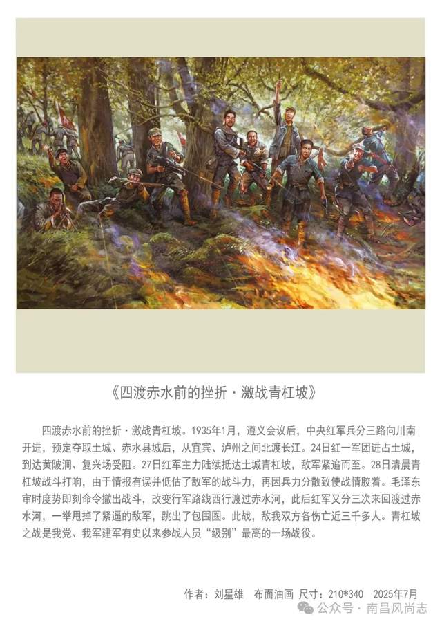 在画展现场,我巧遇了江西师范大学教授、著名油画家刘星雄先生,他有两幅油画巨幅作品参展。分别是《反围剿扩红·八子参军》《四渡赤水前的挫折·激战青杠坡》。两幅油画创作耗时四个多月,高度是2米1,寓意党的成立是1921年。长3米4,寓意红军长征为1934年。