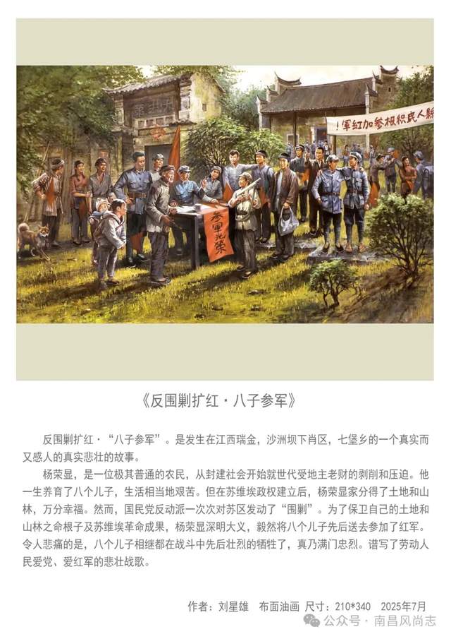 《反围剿扩红·八子参军》,画面人物众多,各具情态,色彩明丽,表现了苏区群众踊跃报名当红军的热烈场景。油画作品背后的真实事件,发生在江西瑞金沙洲坝,一位叫杨荣显的老人把自己的八个儿子送去参军,自己临终前想见儿子一面,可儿子们却全部牺牲在了战场上。杨荣显一家八子参军、前仆后继、壮烈牺牲的事迹是瑞金人民倾尽所有、支援革命战争的一个缩影。