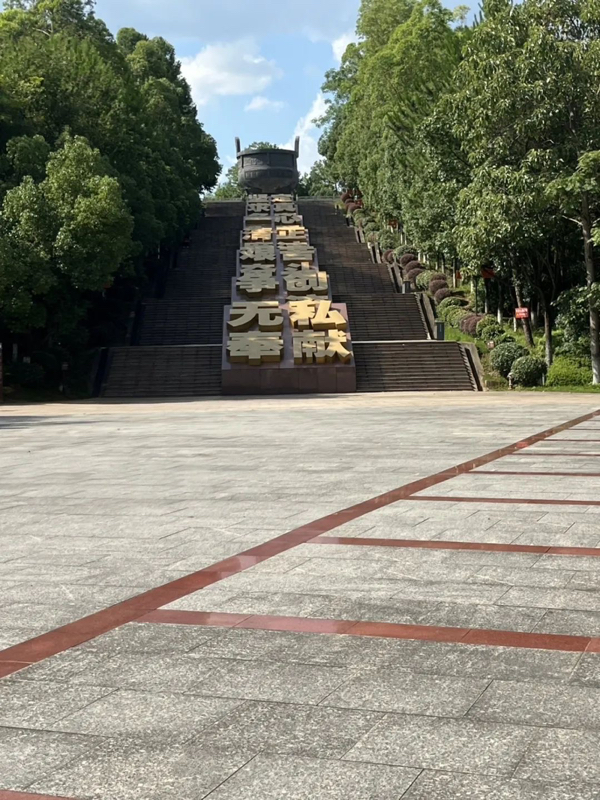 迈出展馆,阳光倾洒在“无私奉献、求真务实、清正廉洁、争创一流”的大字与“苏区精神永放光芒”标语上,熠熠生辉。队员们沿台阶拾级而上,每一步都似与历史共振。台阶尽头,巨大青铜鼎静静伫立,鼎身密布的细微划痕,凝结着代代瞻仰者的致敬印记,无声诉说着往昔牺牲与奉献。